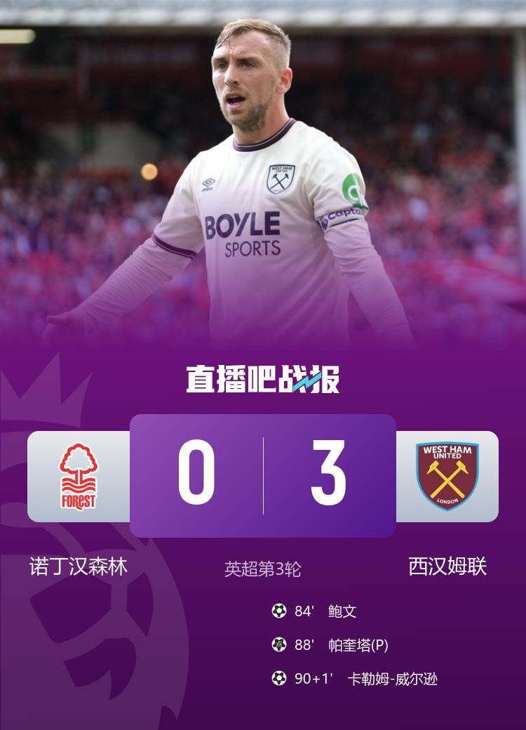 直播吧8月31日讯 北京时间8月31日21:00,英超第三轮诺丁汉森林迎战西汉姆联的比赛在诺丁汉城市球场进行,上半场帕奎塔抽射造险,塞尔斯献精彩扑救,下半场威尔逊抽射被塞尔斯神勇扑出,鲍文抽射打破僵局,萨默维尔造点,帕奎塔点射扩大比分,威尔逊头球破门锁定胜局,最终西汉姆3-0诺丁汉森林取得联赛首胜。
