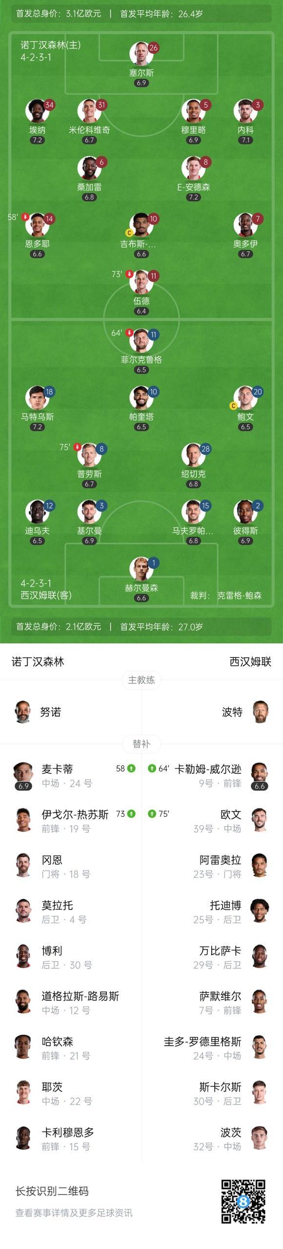 最终,诺丁汉森林0-3西汉姆联。